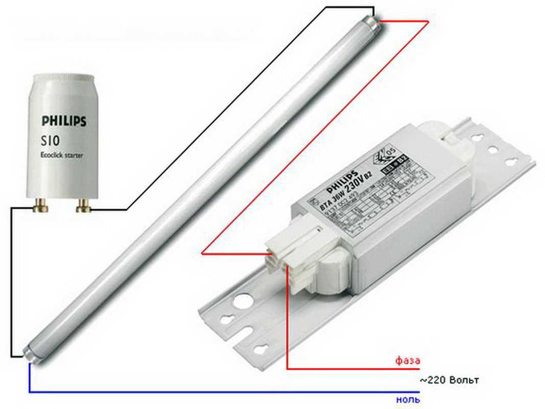 Схему подключения люминесцентной лампы со стартером будет выполнить проще всего. Здесь для примера будет взята лампочка на 40 Вт. Дроссель должен быть с такой же мощностью, а для стартера будет достаточно 60 Вт.