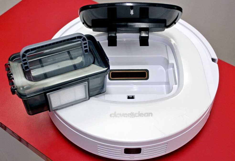 - По окончании уборки, после того, как пылесос вернется на базу, очистите контейнер от скопившейся грязи. Чаще всего он прячется под верхней крышкой устройства и открывается легким нажатием.