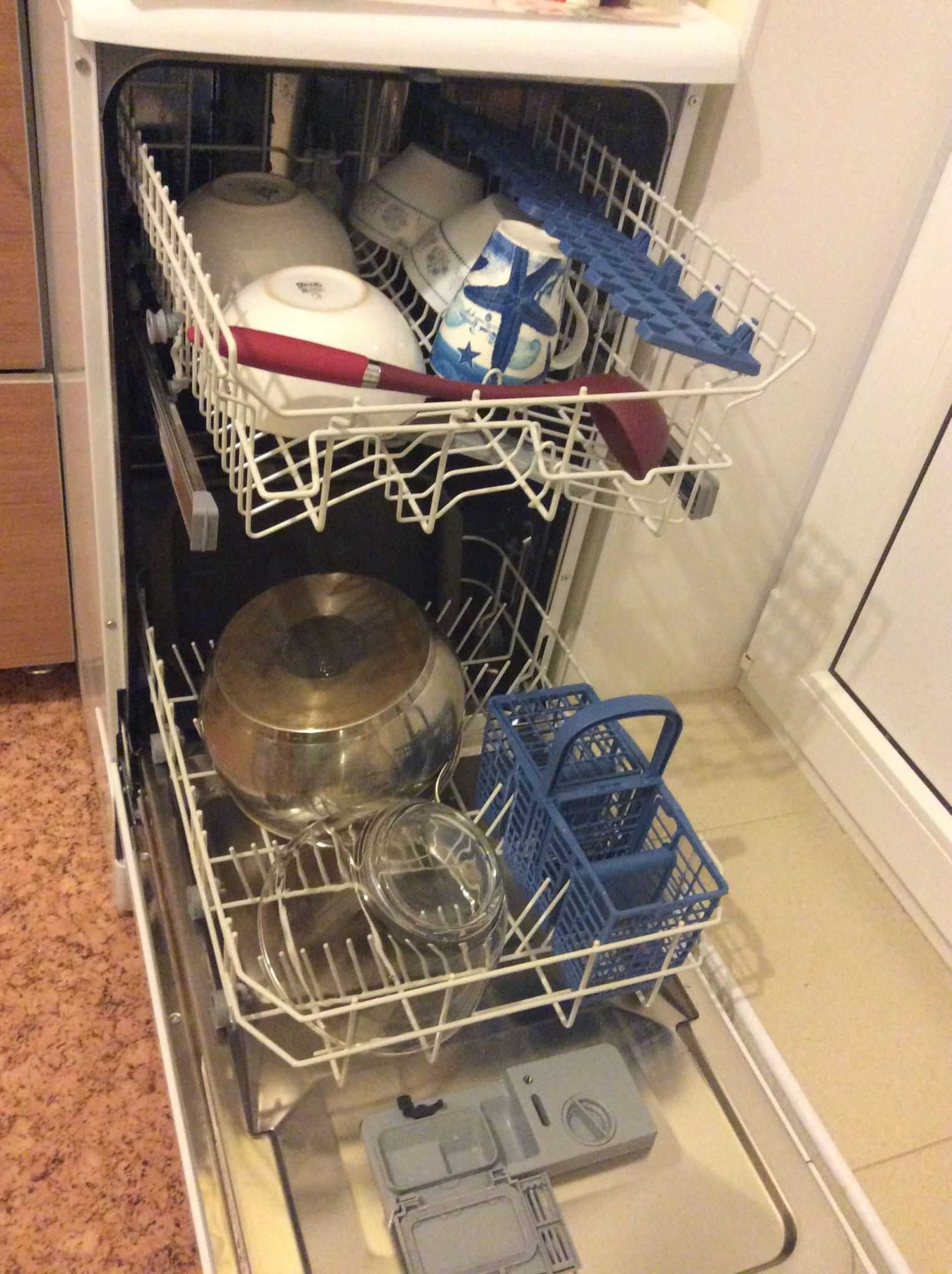 Все грежу встроенной кухней, но пока довольствуемся тем, что есть. По итогу взяли посудомойку, естественно не встраиваемую, т.к. встраивать некуда… Вот с одной стороны понимаю, что это компромиссное решение, а с другой и камня то в ее огород кинуть не могу. Да дизайн не фонтан, но мне реально нравится, как она моет. Это наверно единственная вещь, которую я взяла не обращая внимания на внешний вид. Посоветовал мне ее приятель, который непросредственное отношение имеет к сборке таких машин. Мне указал на эту. В обращении она простая, ну а что там всего 5 программ. Сейчас утюги сложнее, чем она. По процессу все стандартно За день накапливаем посуду, кладем прямо в нее. Кстати лишнюю еду когда смываю, когда нет. Ну зависит от времени. Заметила, что когда смыта лишняя еда, внутри она чище. Но запаха нет. Подумаю, как дальше буду делать. Ставится программа и вперед. В зависимости от времени вынимаете чистую и сухую посуду. Ополаскивателя на посуде ни разу не замечала. Отмывает до скрипа. Как буду с ней расставаться, даже не знаю. Уж очень хороша.