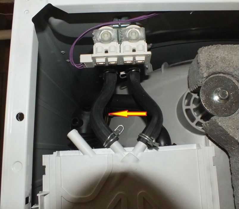 Узнать состояние шланга можно, заглянув за машину и визуально определить его состояние, если все в норме, то проблема заключена не в нем. Чтобы добраться до помпы, придется разобрать почти всю машину, так как она находится в самом низу, кроме этого, машину переворачивают вверх ногами. Типичные неисправности насоса — засорение посторонними предметами, а пластмассовая крыльчатка очень часто ломается или проворачивается на оси из-за блокировки попавшим посторонним предметом.