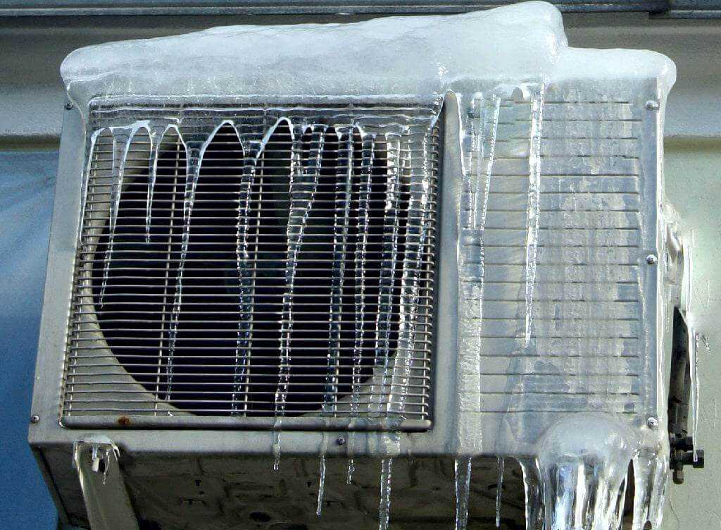 - Наледь на наружном блоке. Она образуется, если кондиционер включается на обогрев при высокой влажности и значительной минусовой температуре. Для предотвращения обледенения нужно оснащать устройство системой авторазморозки. Если такая не установлена, кондиционер нужно перевести в режим охлаждения и дождаться оттаивания. В целом специалисты не рекомендуют включать кондиционер на обогрев, если температура на улице опустилась ниже минус 10 градусов. Это приводит к загустению масла и повышает износ оборудования.