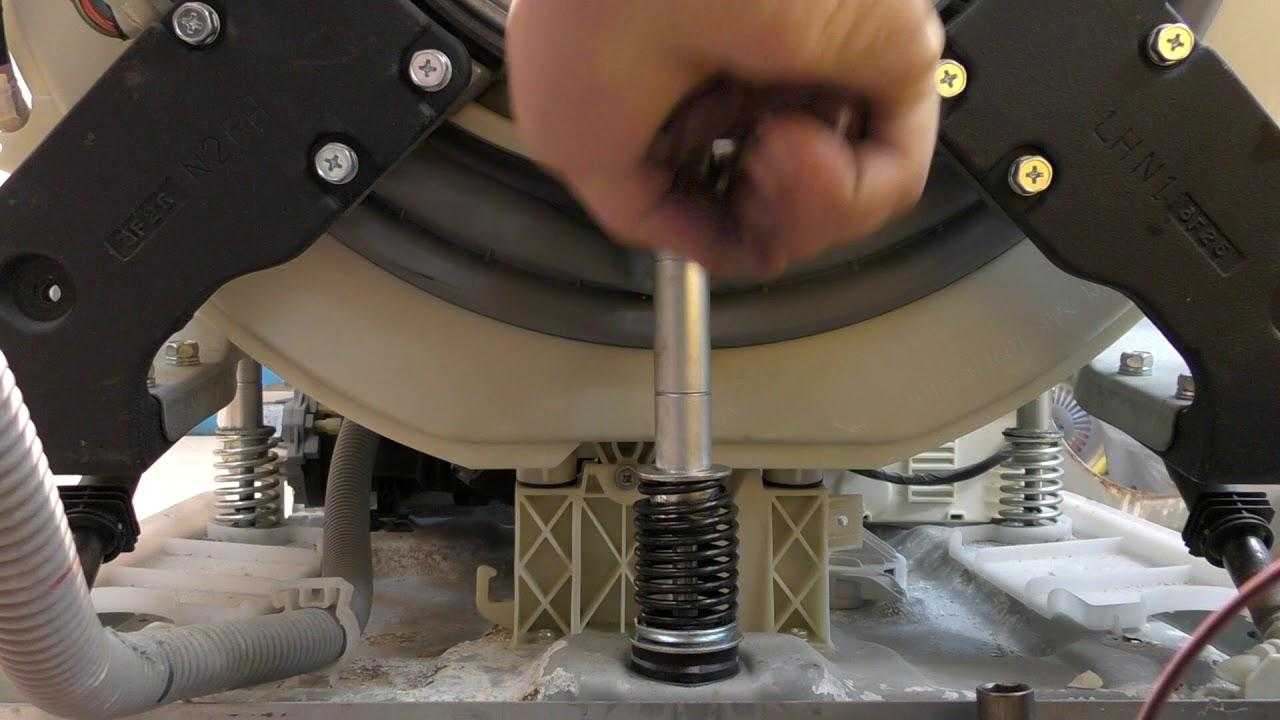 Естественно, что амортизаторы постепенно изнашиваются: появляются люфты, шток проскальзывает, а барабан начинает биться о корпус машины, что сопровождается неприятным звуком и сильным покачиванием оборудования.