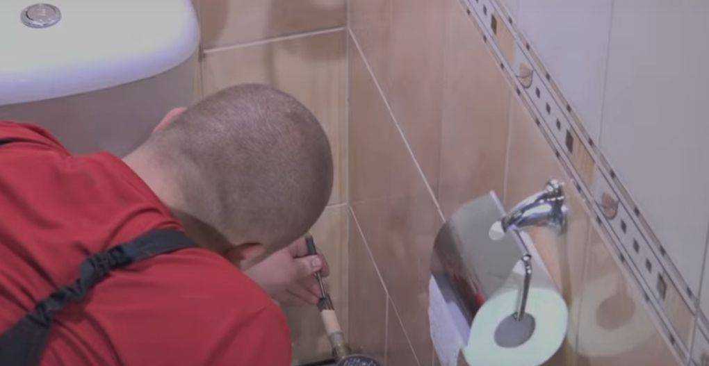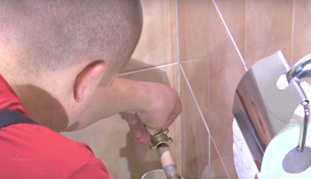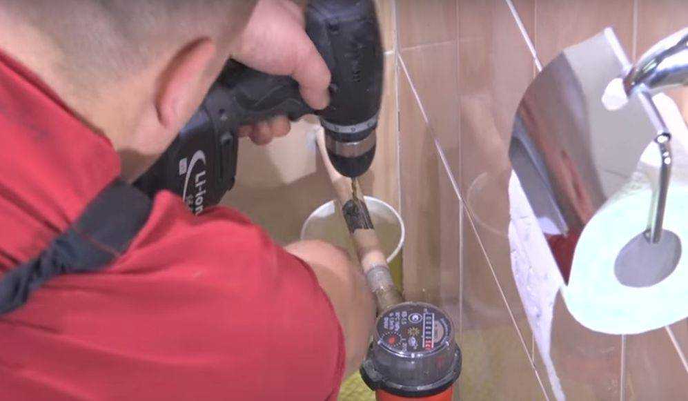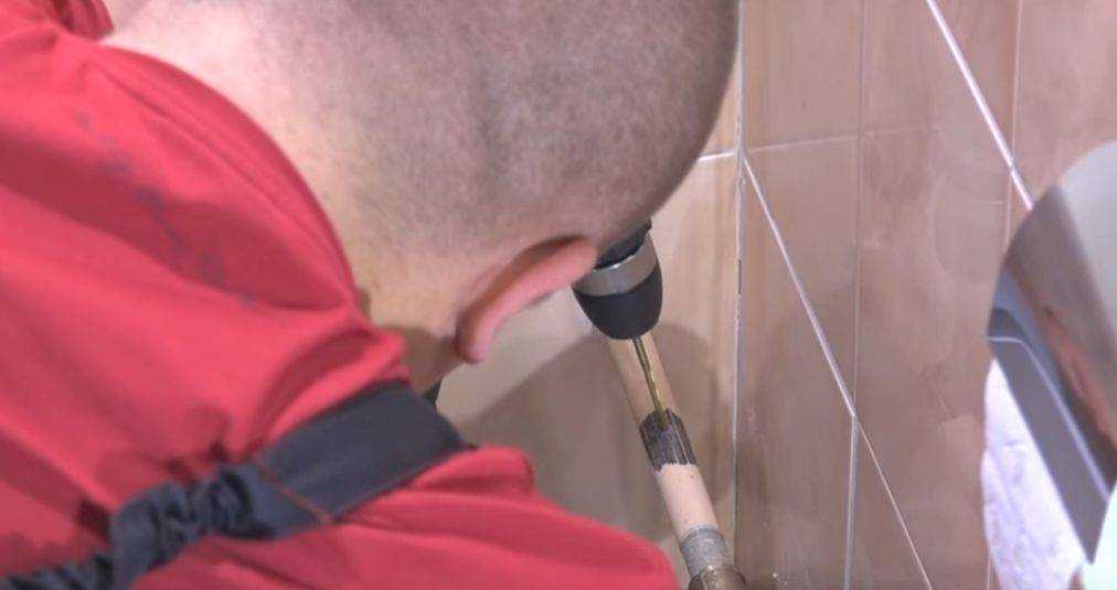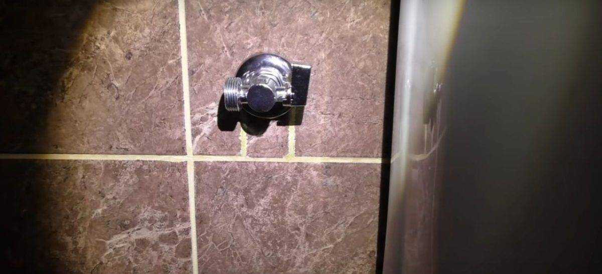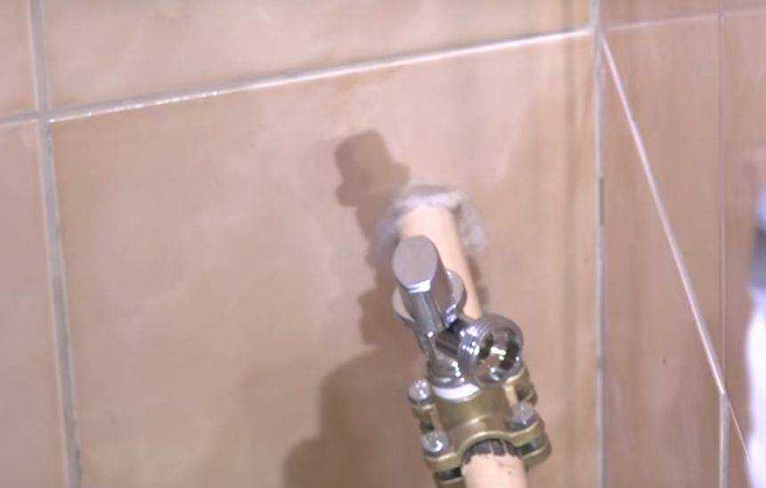 угловой кран 1. Вырезаем сквозное отверстие в стене для вставки крана. Для этого лучше всего использовать электродрель. После закрываем неровности плиткой. С другой стороны вырезаем отверстие в трубе (как в случае с установкой муфты) и прикручиваем переходник.