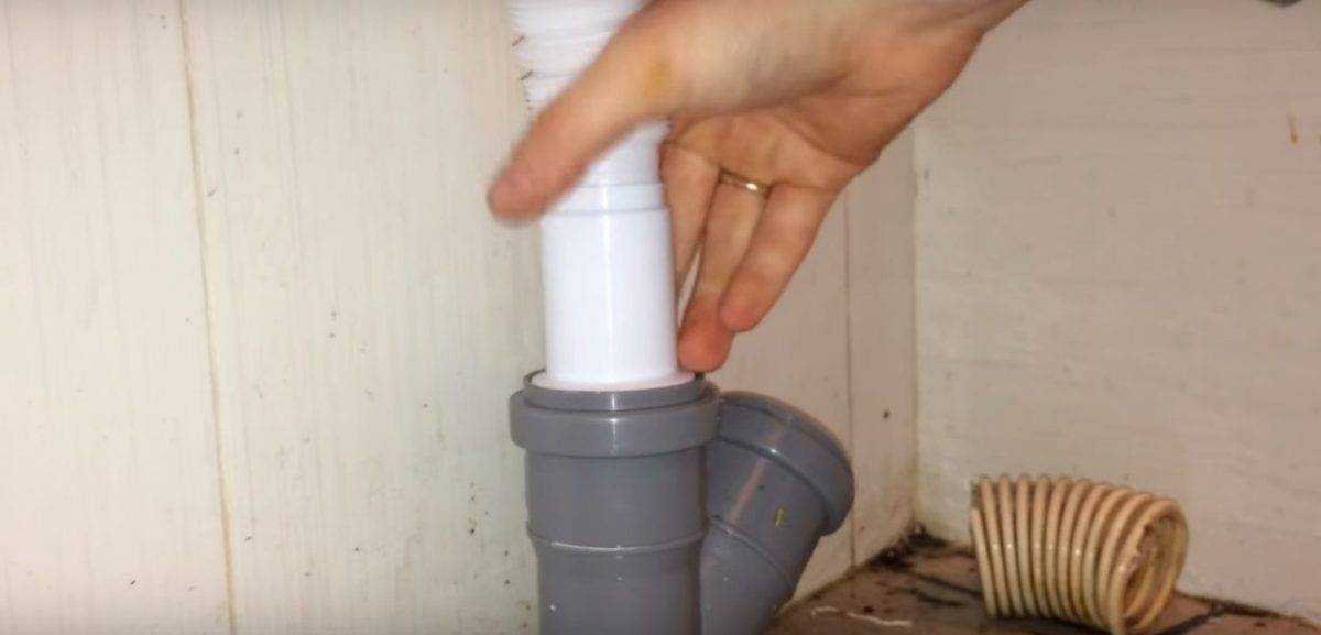 патрубок 1. Покупаем в магазине специальный патрубок для подключения труб с умывальника и стиральной машины. После этого монтируем его в то же отверстие, где ранее была труба от умывальника.
