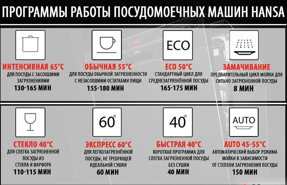 Программы . От количества программ зависит универсальность и функционал техники. Если есть дополнительные режимы, можно выбирать лучший вариант для мытья посуды, опираясь на ее степень загрязнения. Даже с 4-5 стандартными режимами можно добиться хорошей мойки посуды, но количество ресурсов воды и электричества будет увеличено. Программный набор нужно выбирать, полагаясь на личные потребности. Многие опции могут остаться невостребованными, так что не стоит за них переплачивать.