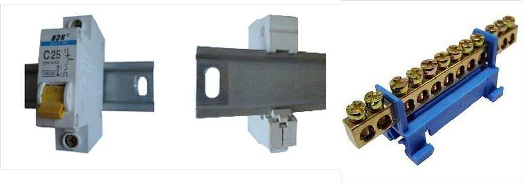 - DIN-рейка. Это изделие крепится к задней стенке пластикового или металлического бокса при помощи саморезов. Она служит для размещения автоматических выключателей, счетчика и прочих устройств автоматики.