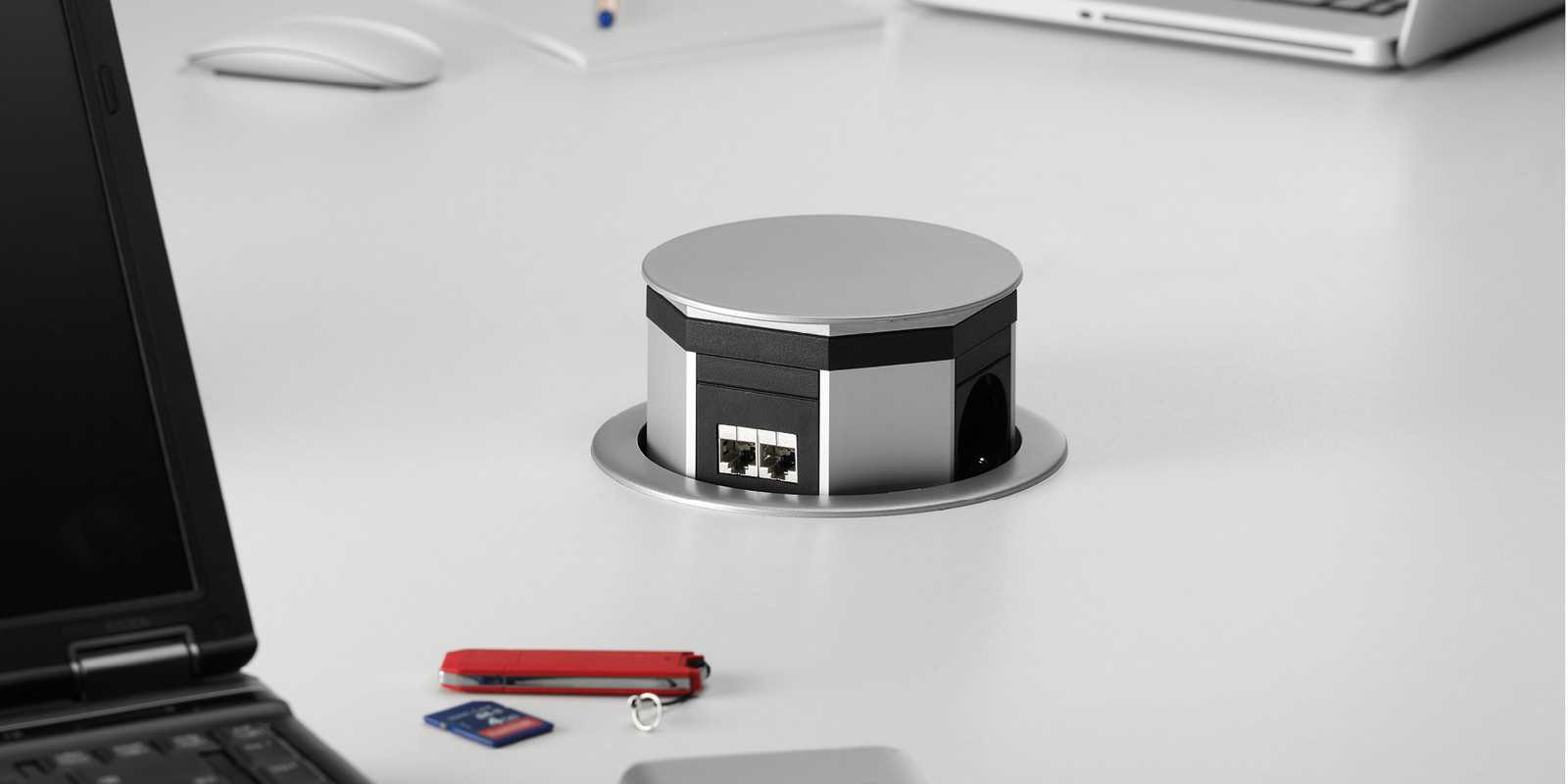 За счёт расположения розеток по периметру вертикального выдвижного элемента высота его подъёма над столешницей уменьшается.