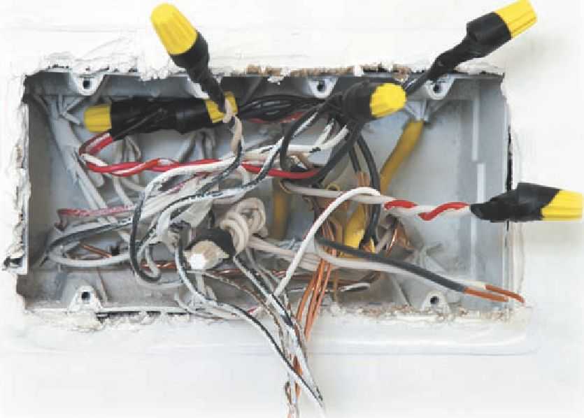Рис. 7.23. Снизу к распределительнойкоробке подходит питающий кабель, которыйрасщепляется на несколько отходящих проводов |