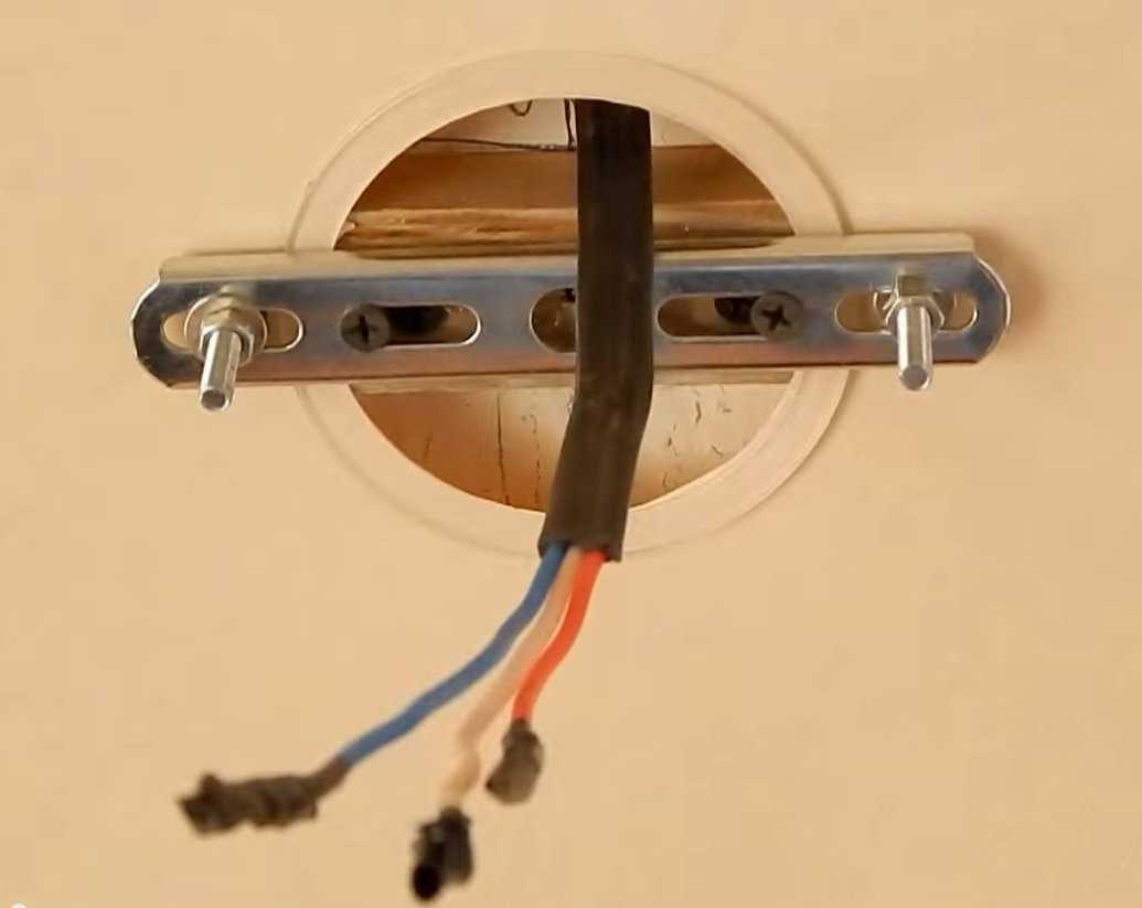 Все это делается до установки натяжного потолка, но уровень его установки (отступ от базового потолка) должен быть известен. Концы электропроводки также необходимо подвести к месту монтажа.