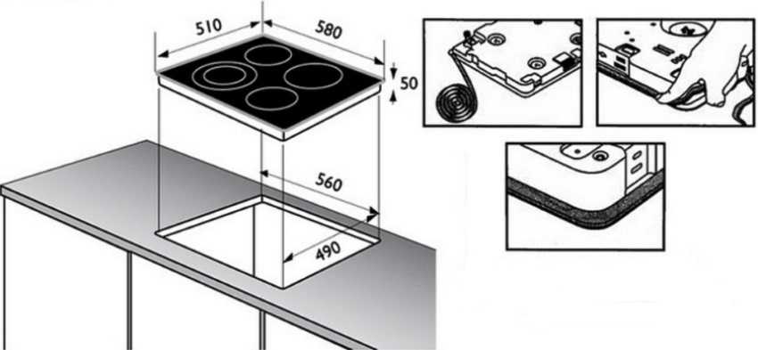 - Разметка отверстия под прибор. При помощи линейки нужно будет измерить длину и ширину варочной поверхности, чтобы правильно установить ее на место. Наиболее оптимальным способом измерения считается использование специального шаблона, который можно сделать из обычного картона. Некоторые модели плит в своей комплектации содержат подобный шаблон.