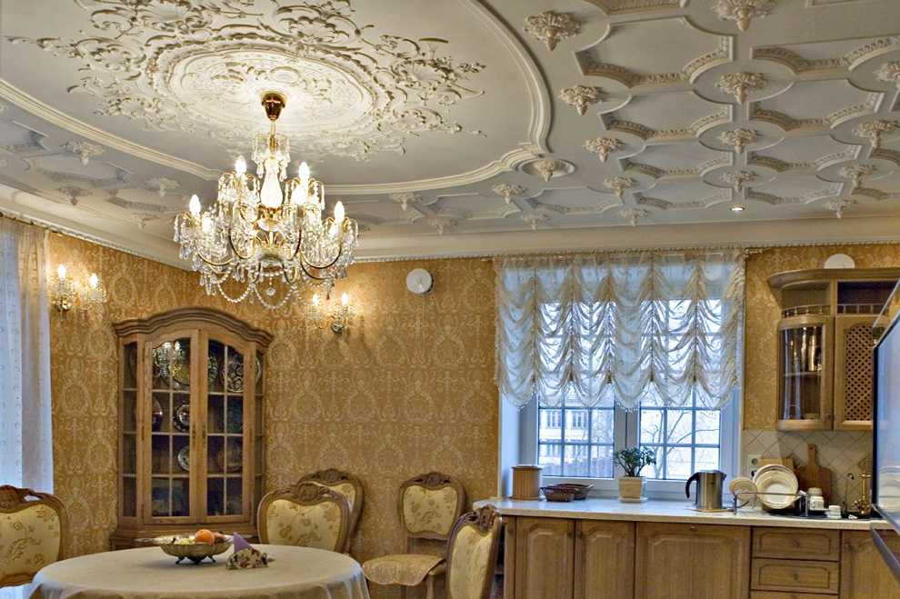 Классицизм и ампир предполагают как плоский, так и куполообразный потолок, декор которого располагается по всей площади в виде флоральных или геометрических гирлянд, часто с золочением, серебрением или патинированием лепнины. Особо просторные помещения могут разделяться колоннами с несущими или фальш-балками на отдельные зоны, потолок каждой из которых украшен своей розеттой, они могут быть разного размера, но объединены общим мотивом. Главное, чтобы декор потолочной лепнины гармонировал с остальной отделкой помещения.