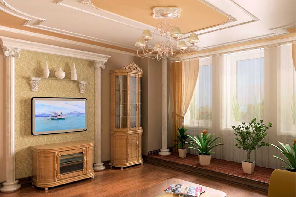 - Классический интерьер также не обойдется без потолочных розеток, молдингов, реек и колонн. Но в этом случае декор должен быть выдержанным в одной цветовой гамме, без лишних завитков. Подчеркнуть натуральность отделки несложно – покупать изделия с имитацией дерева, камня. Например, балки из пенопласта с облицовкой под древесину смотрятся красиво, стоят недорого.