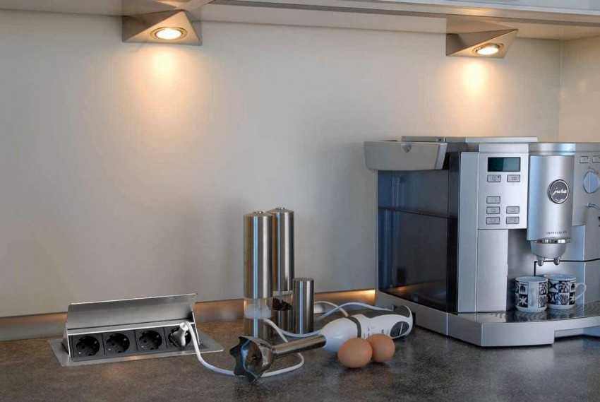 Встраиваемая, или скрытая розетка — один из лучших вариантов для мелкой кухонной техники. Она не мешают на рабочем столе, не портят интерьер. Для монтажа розеток этого типа можно выбрать любое удобное место. Ее размещают в столешнице, под ней (выдвижной вариант) или в стенке шкафа.