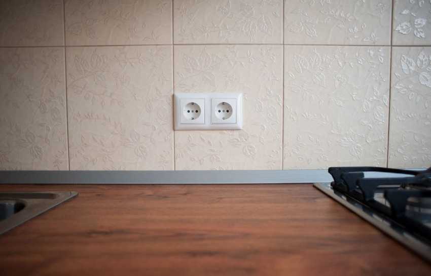 - еще один важный момент касается установки в месте расположения фартука. Розетки на кухне должна возвышаться над столешницей, по меньшей мере, на 10-15 см, чтобы исключить риск попадания в них капель воды и жира.