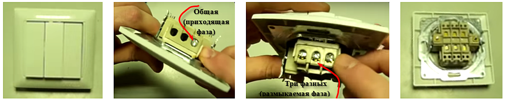 Конструкции и схема коммутации проходных выключателей более сложные, чем обычных моделей, но общий принцип остается прежним, через контакты проходит фазный провод. Есть варианты с одной, двумя и даже с тремя клавишами в одном корпусе