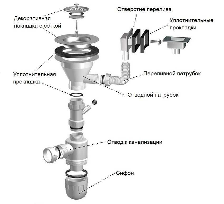 Процесс, как собрать сифон для мойки недорогой модели из множества деталей, состоит из следующих этапов: