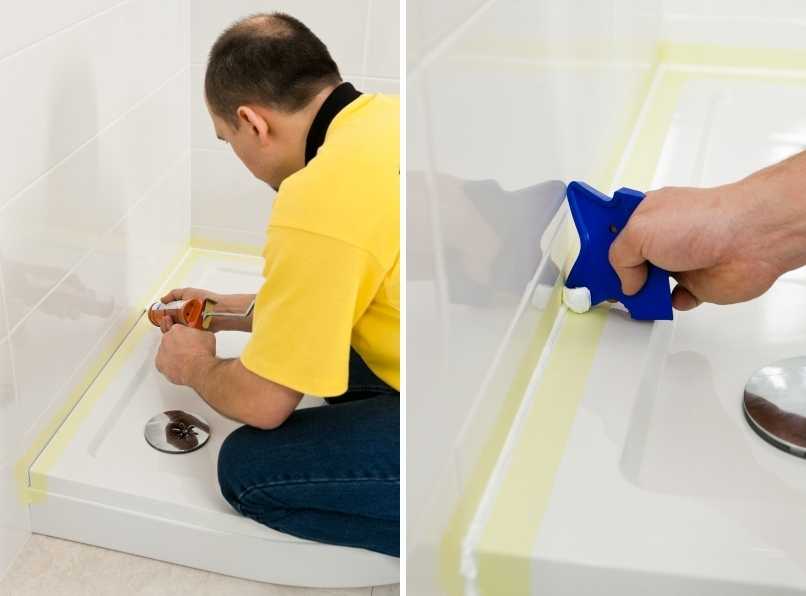 12. Приклейте ножки к полу, чтобы поддон не двигался во время использования. Нанесите силикон из пистолета, вокруг ножек и разотрите пальцем.