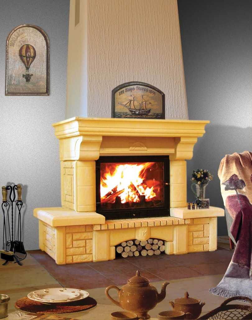 В эту же разновидность конструкции можно отнести и камин с открытой или закрытой топкой. Он используется не только в декоративных целях, но и позволяет эффективно обогреть помещение площадью – 15-20 кв. метров.