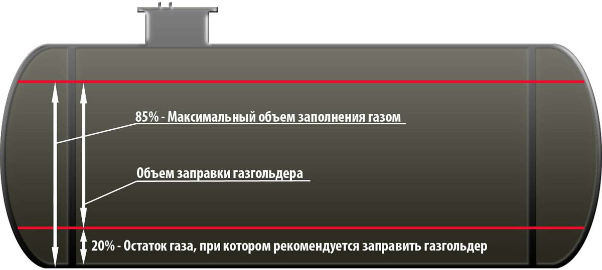 - Полный объем газгольдера не соответствует фактическому. Резервуар наполняют на 85%, чтобы обеспечить надлежащие условия для испарения газовой смеси.