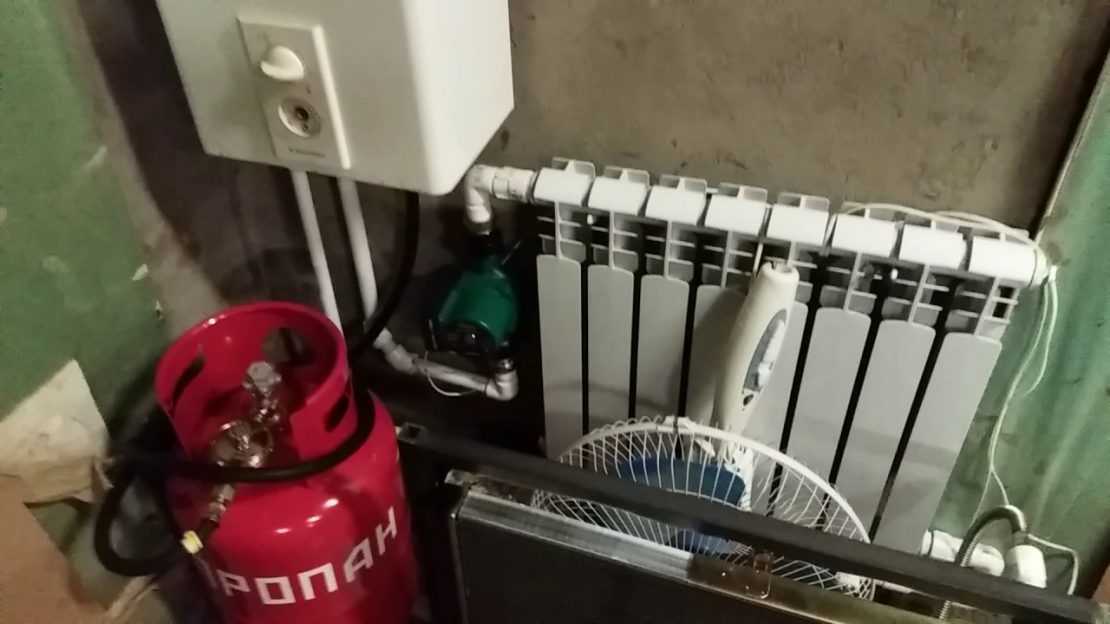Фото 2. Красный баллон с газом и гибкий шланг, который используется для подключения к котлу.