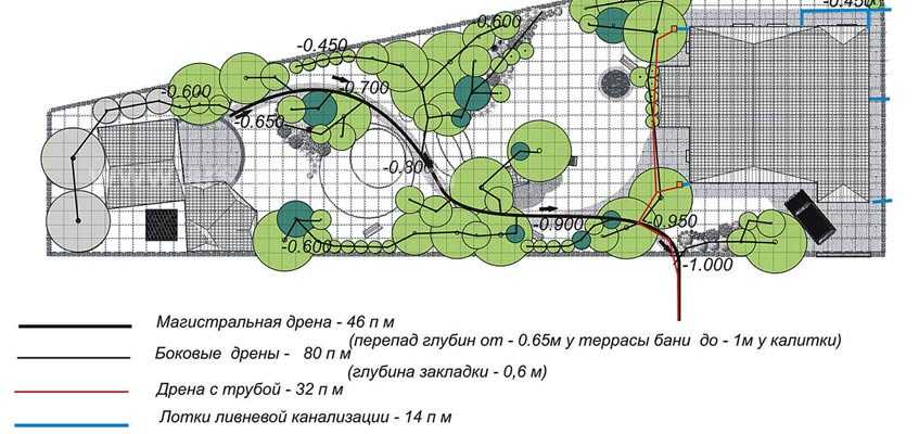 Сформированная таким образом схема дренажной системы — готовая проектная документация для расчетов объемов работ и материалов и выполнения операций по сооружению системы.