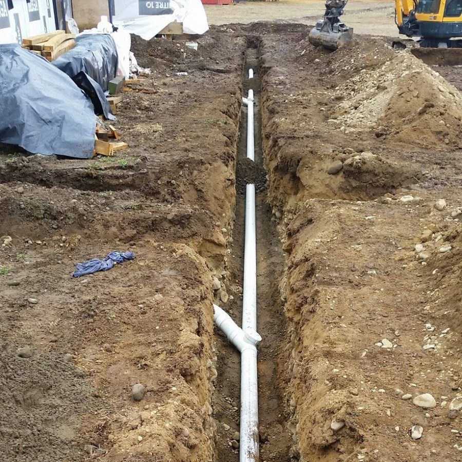 Важно! Траншеи обустраивают под уклоном. Угол зависит от характера грунтов и составляет не мене 1-2% дл глинистых почв и не менее 3% (3 см на погонный метр траншеи) для песчаников и супесей