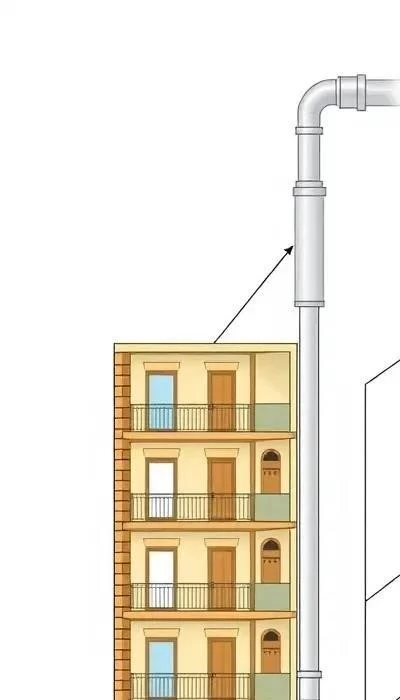 Вентиляционная труба должна быть выведена на крышу здания и защищена от попадания осадков и мусора.