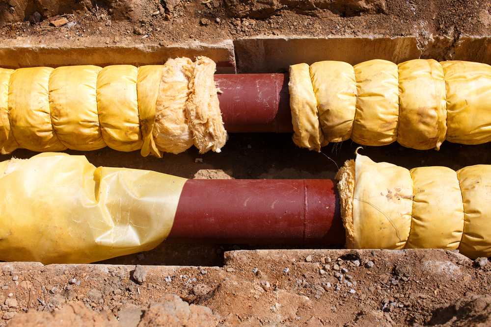 Если используются рулонные утеплители, то сначала в траншею укладывается слой утеплителя. Поверх укладывается собранный участок трубопровода. Его обёртывают рулонным материалом с небольшим нахлестом и крепят проволокой или синтетической лентой.