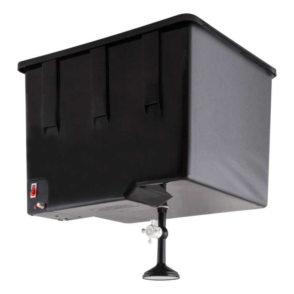 - Более простая разновидность – пластиковый бак с подогревом. Он обладает компактной формой и малым весом, что значительно облегчает его установку. Система не нуждается в постоянной подаче воды, что является и плюсом, и минусом одновременно. Потому что выходит так, что нагревательный элемент в этой конструкции должен отключаться после нагрева.