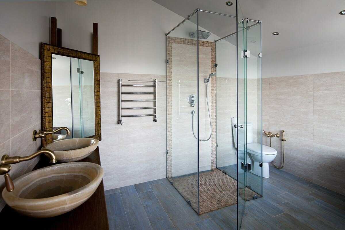 Душевую также лучше отделать в тон самой ванной комнате, в том случае если дизайн не предполагает обратного. Тем более, если стенки кабины будут выполнены из прозрачных материалов, то душевая станет продолжением комнаты, будет казаться прозрачной, создавая эффект отсутствия, при том, что пол там будет выполнен вровень со всем помещением.