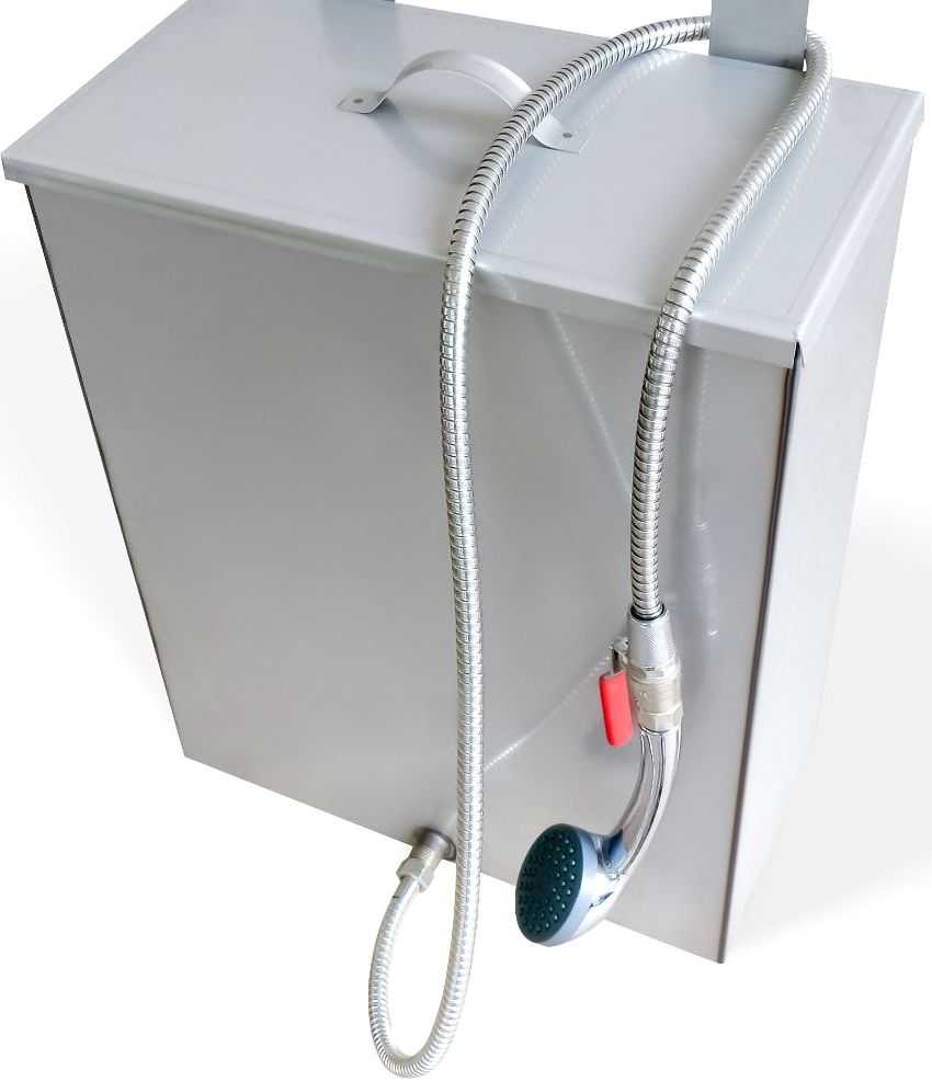 - Бак из оцинкованной стали, который предназначен для низких душевых. Он имеет плоскую форму и короткую встроенную душевую лейку. Объем его составляет 100 и 200 литров. Работает такой бак по типу бойлера и нуждается в постоянном водоснабжении.