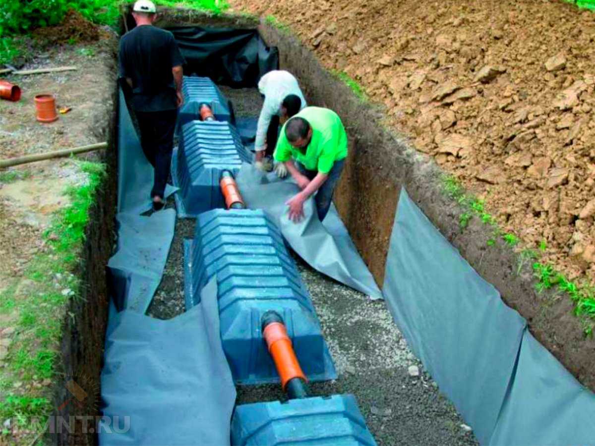 - к яме проводятся траншеи для укладки труб канализационной сети. Дно траншей также выравнивается при помощи песка и гравия, производится гидроизоляция.