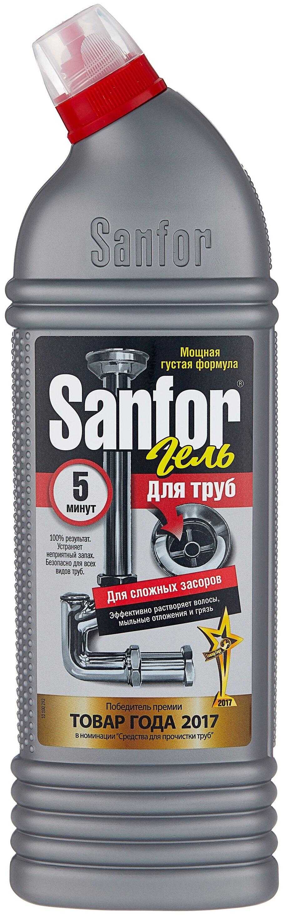 - Sanfor справляется с сильными засорами в любых канализационных трубах. Гель содержит хлор, что позволяет провести дезинфекцию трассы. Обычно бутылки объемом в 750 мл достаточно для 4 применений.