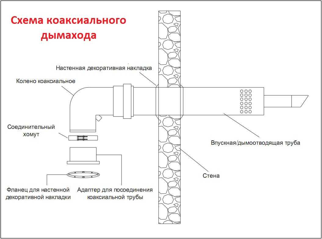 Коаксиальная труба – это две трубы, одна больше диаметром, вторая поменьше и находиться одна в другой. По большому радиусу воздух поступает в котел, а по меньшему выходят отработанные газы.