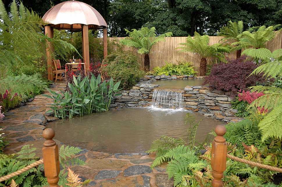 Дно искусственного водоема на участке можно украсить гладкими камнями либо декоративным щебнем. Береговая часть декорируется при помощи природного камня, плитки или гальки. Растения, которые будут располагаться в воде, помещают в контейнеры, фиксируют и монтируют на днище или ступени пруда. Это позволит облегчить уход за культурами и заменять их, при необходимости.