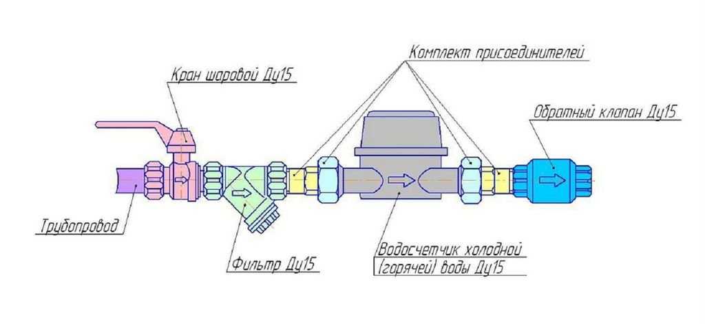 Перед тем, как приступить к установке приборов учета холодной и горячей воды, необходимо ознакомиться со всеми прилагаемыми описаниями и инструкциями. Затем раскладывают детали в одну линию, согласно схеме монтажа.