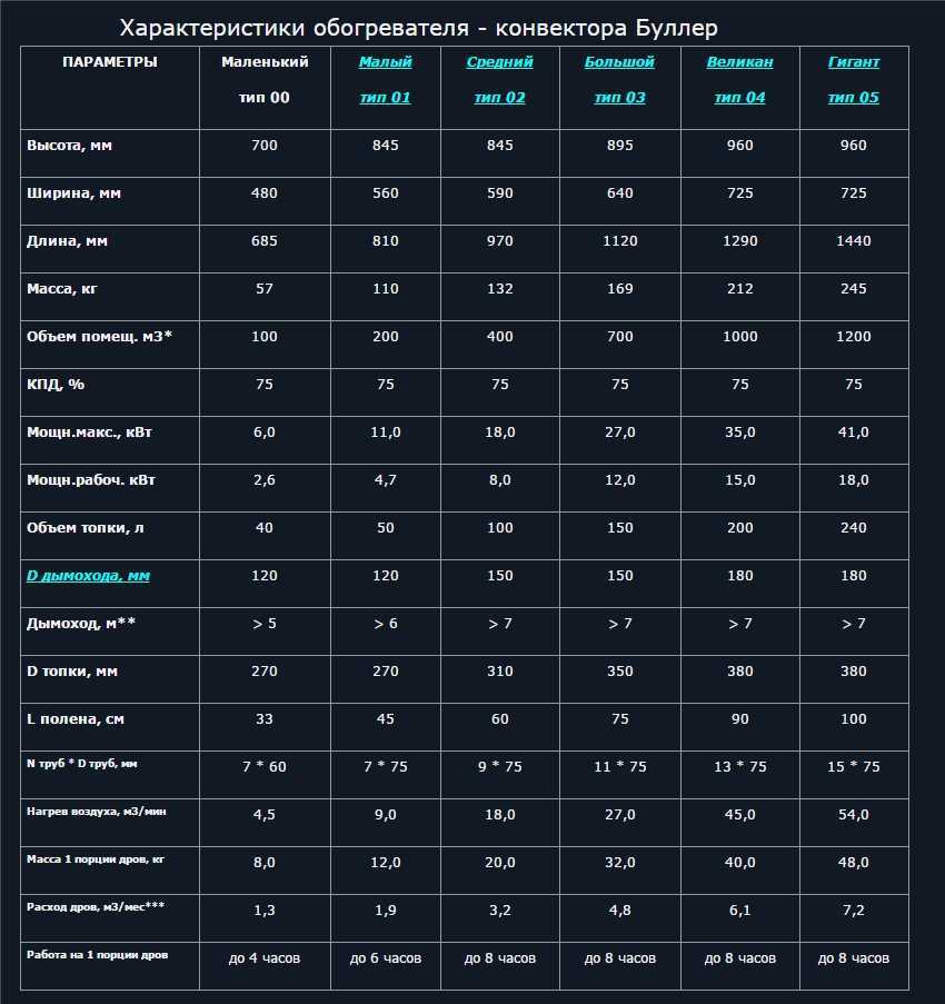Технические характеристики печей конвекционного типа «Булерьян этого производителя сведены в таблицу.
