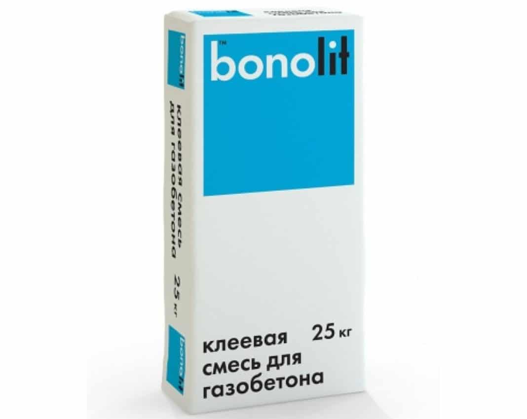 - Bonolit – сухой концентрат для склеивания газосиликата заслуживает внимания абсолютной экологичностью состава, не имеет токсичных примесей, востребован как в наружных, так и внутренних работах.