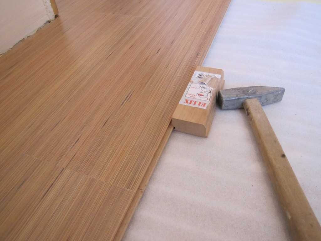 Монтаж делается стандартным способом. Сначала происходит монтаж клинков, необходимых для деформационного зазора. Далее у стены, параллельной световому потоку, размещают первую доску. Эта хитрость позволяет получить швы, параллельные световому потоку. Начинают монтаж с угла и поэтому ламель припирают к клинкам, расставленным под стенами, образующими угол. Доску надо положить замком на себя. Далее до конца первого ламеля прикладывают второй. Его вставляют в замок под углом 45 градусов. Затем опускают. Этим способом собирают первый ряд, за ним второй, третий и так до конца. Во время монтажа ламели со слишком великой длиной и шириной обрезают.