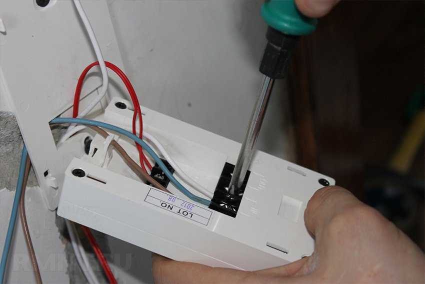 Остается установить терморегулятор. Как правило, для него выбирают легкодоступное место на стене, подключаю по инструкции. Термодатчик укладывается на пленку и подсоединяется терморегуляторной проводкой.