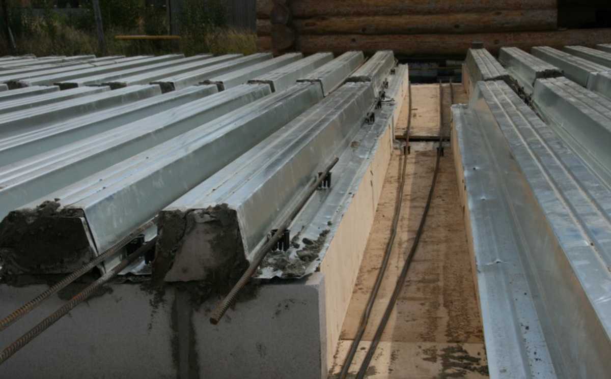 Когда монтируют готовые плиты перекрытий, срезают всю верхнюю часть блоков, а если проектом предусмотрены деревянные балки, под них выполняют вырезы. Концы балок, которые будут находиться в бетоне, перед укладкой гидроизолируют.
