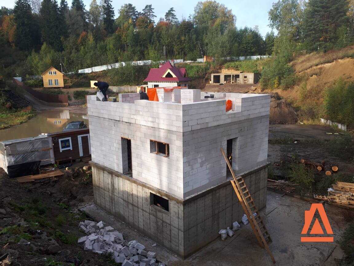 Уложенные межэтажные перекрытия утепляются с использованием легких теплоизоляционных материалов, изолируются. Кладка стен второго этажа выполняется по перекрытиям следующим образом: первый ряд блоков выкладывается на раствор, следующие ряды — на клей. Аналогично можно положить перекрывающие конструкции для мансардного этажа, жилого цоколя, подвала.