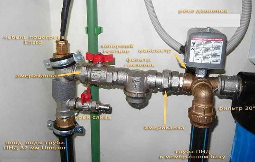 Он накручивается на патрубок на задней части корпуса, к остальным выходам подключают гидроаккумулятор, подающий шланг от насоса и магистраль, которая идет в дом. Можно установить еще грязевик и манометр.