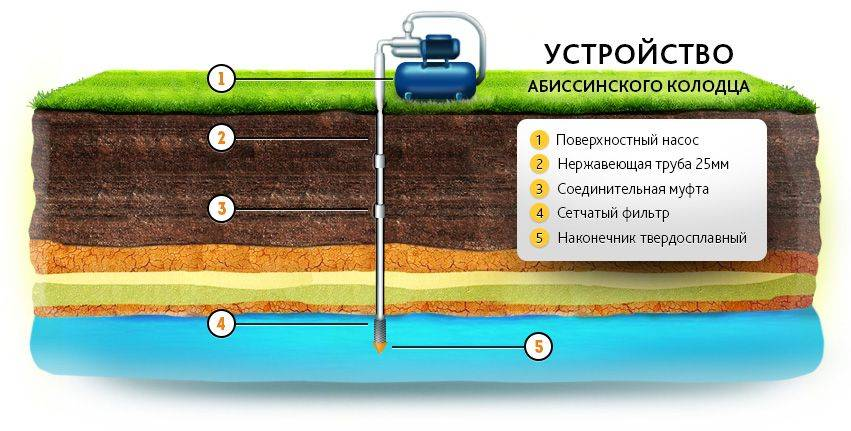 Трубы выполняют функцию ствола, дополнительной обсадки абиссинская скважина-игла не требует. Ее не бурят, а погружают в грунт посредством забивки.