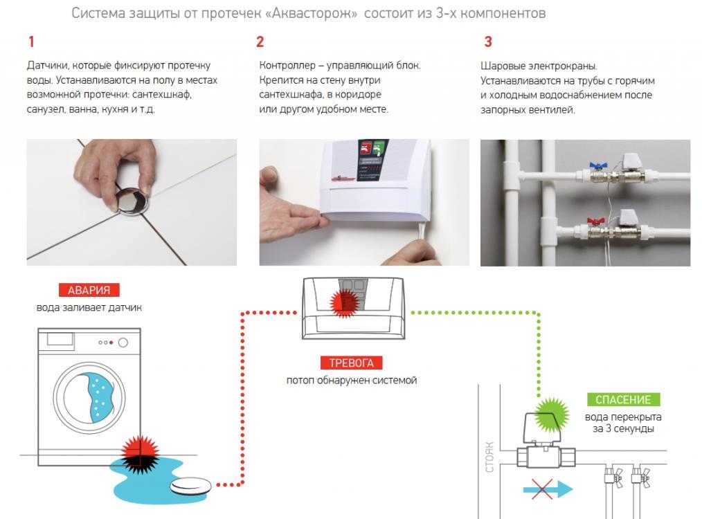 Защита от утечки воды может быть в комплекте, а можно собрать свою конфигурацию из компонентов