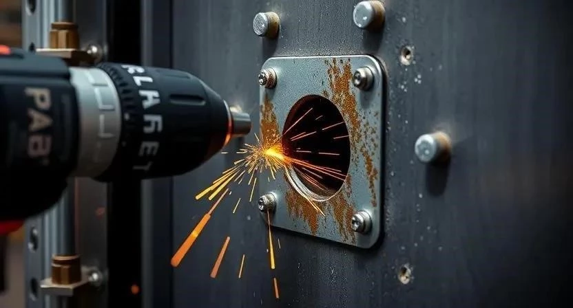 - Сверление отверстий: Используя дрель и сверла по металлу, аккуратно просверлите отверстия в отмеченных местах. Важно соблюдать глубину сверления, чтобы не повредить дверь.