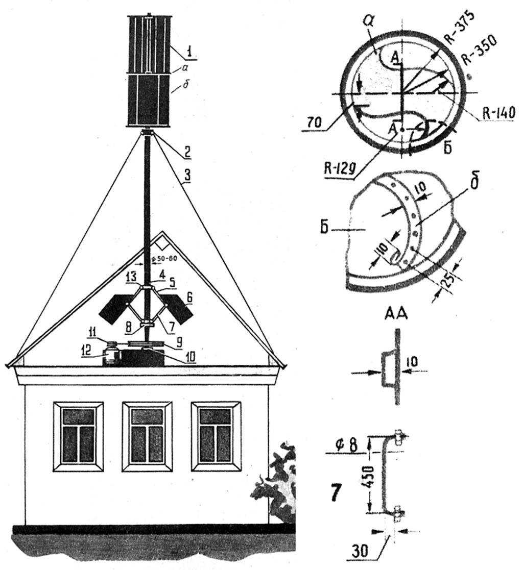 — генератор, который вырабатывает переменный ток, и в дальнейшем преобразуется в постоянное напряжение, предназначенное для зарядки аккумуляторов. От скорости ветра зависит и мощность генератора;- лопасти, предназначены для передачи вращения к валу генератора через редукторы и стабилизаторы скорости вращения ротора генератора; — мачта ветряка должна иметь достаточную высоту. Чем выше находятся лопасти, тем больше они получат энергии ветра.