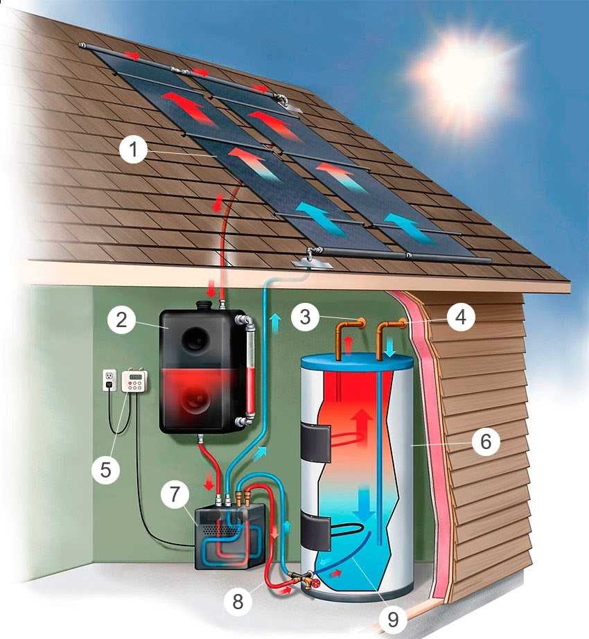 1.Солнечный коллектор. 2. Буферный бак. 3. Горячая вода. 4. Холодная вода. 5. Котроллер. 6. Теплообменник. 7. Помпа. 8. Горячий поток. 9. Холодный поток.