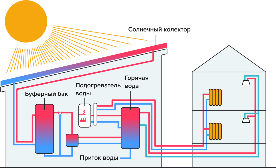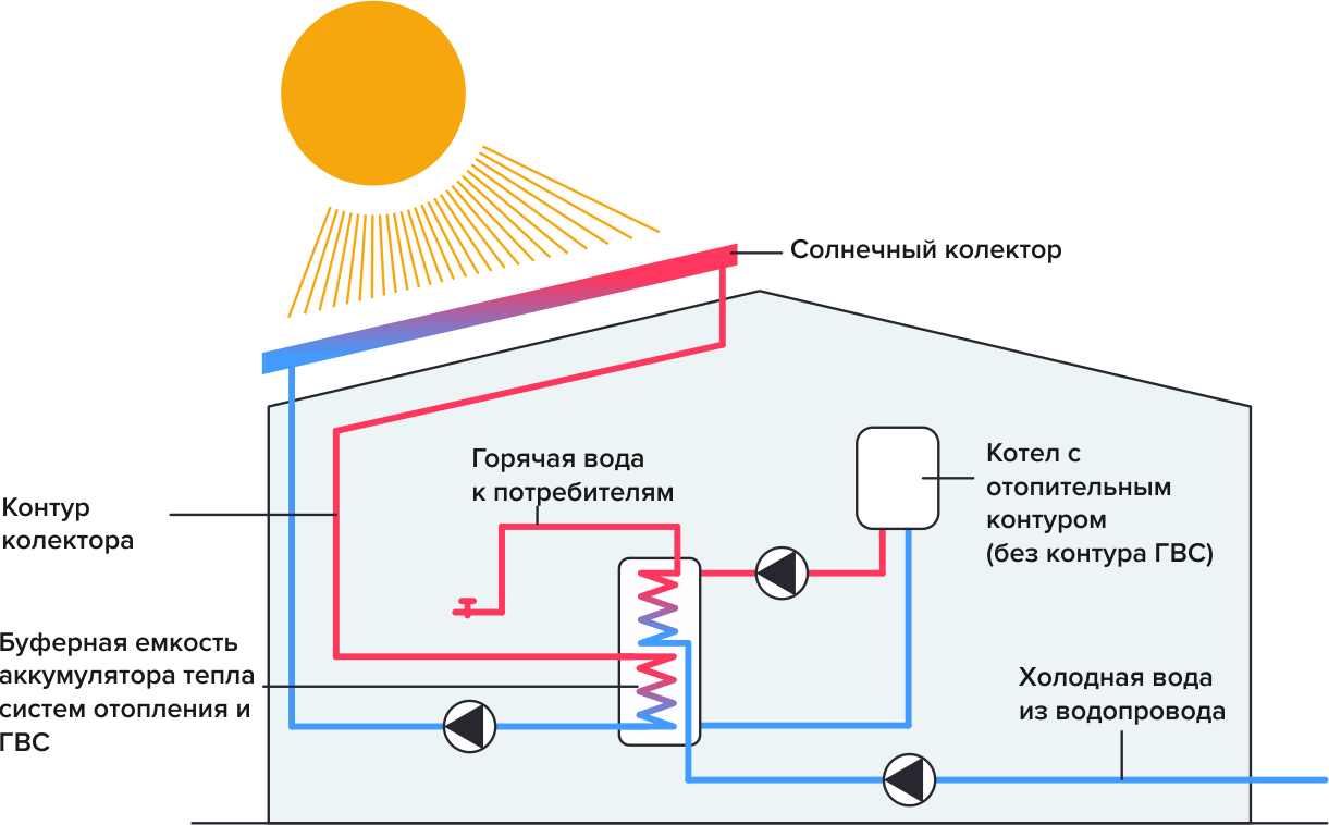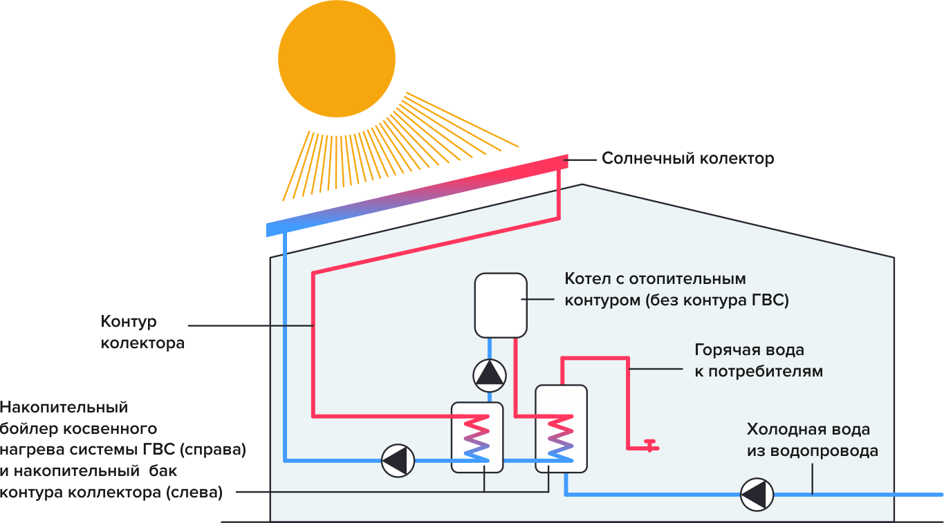 Этот вариант подразумевает использование емкости косвенного нагрева, которая работает на твердом или «голубом» топливе. Поздней весной и летом котел можно отключать, поскольку воду будет нагревать коллектор. А вот зимой эффективность гелиосистем в северо-восточных регионах России не очень велика, так как интенсивность солнечного излучения минимальна. По этой причине коллектор используют в качестве источника дополнительного подогрева к отопительным системам.