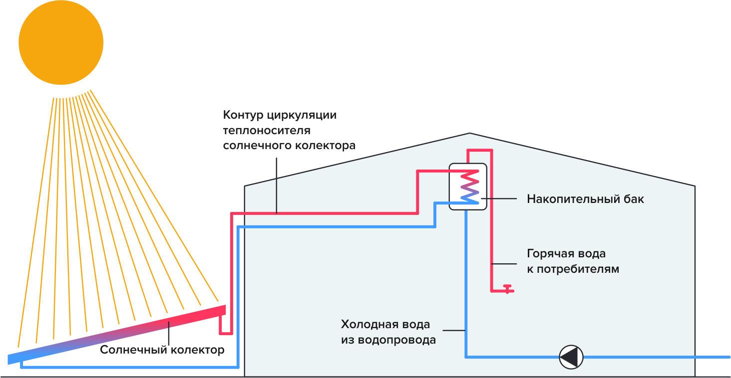 Циркуляцию воды в коллекторе делают одним из двух способов: естественным или принудительным способом. В баке-аккумуляторе может монтироваться дополнительный элемент, нагревающий жидкость, который будет включаться при достижении низких температур окружающей среды и поддерживать температуру воды, например, зимой, когда солнцестояние непродолжительное.